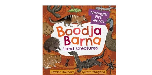 Jayden Boundry is the author of this introductory Noongar language board book for young children. The book teaches the Noongar names for common land creatures and contains a QR code for links to pronunciation audio guides and videos. Keep an eye out for the next in this series!